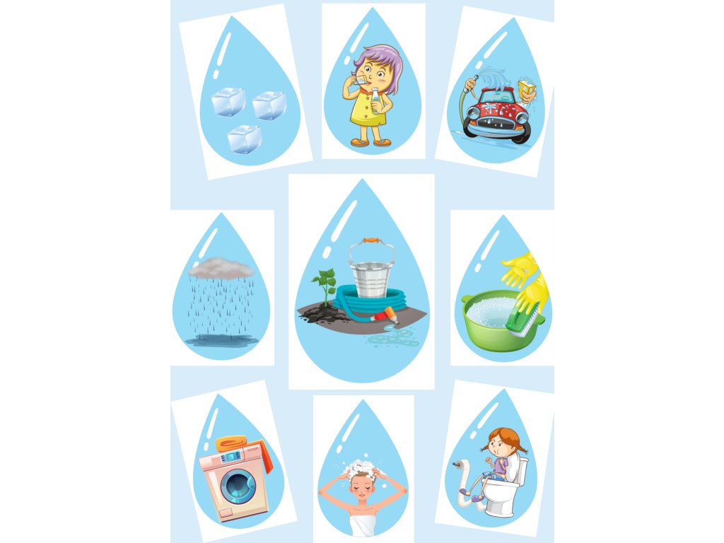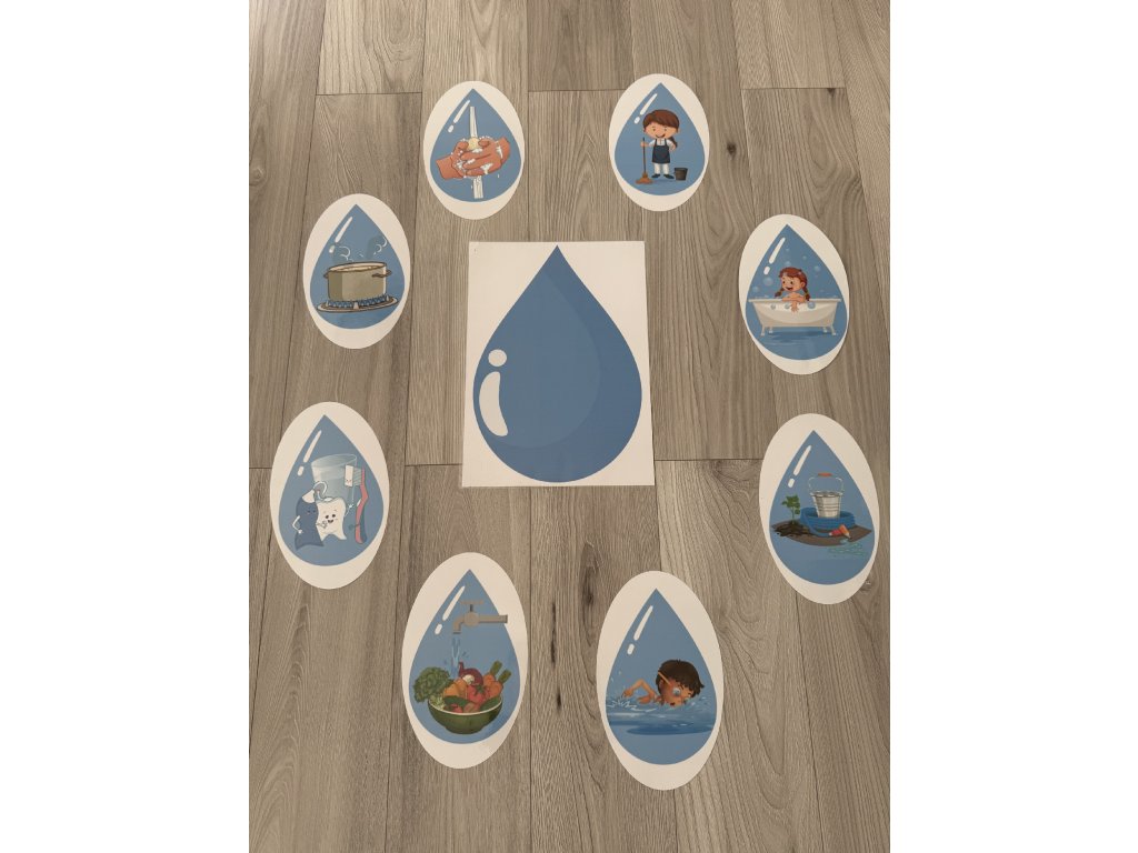 které zobrazují běžné životní situace, kdy se setkáváme s vodou. Plakáty jsou potaženy transparentní fólií, umožňující jejich opakované použití.