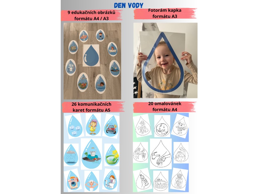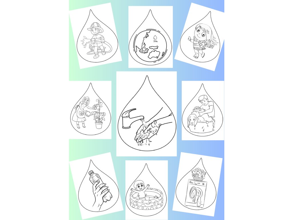 - 20 kusů výkresů formátu A4 s omalovánkami zobrazujících různé okamžiky, kde se dostáváme do kontaktu s vodou.
