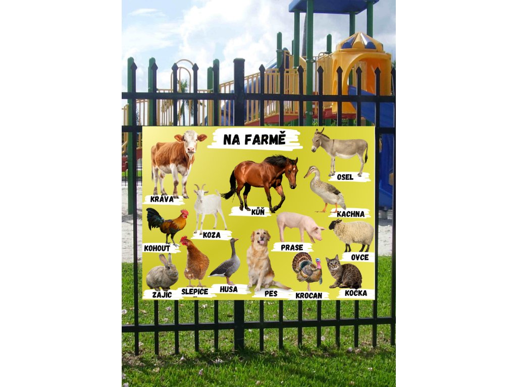 aby se hodila k jakémukoli exteriérovému prostředí. Montáž: Tabule má na každém kraji otvor, vhodný k přišroubování tabule nebo jejímu přivázání o plot.