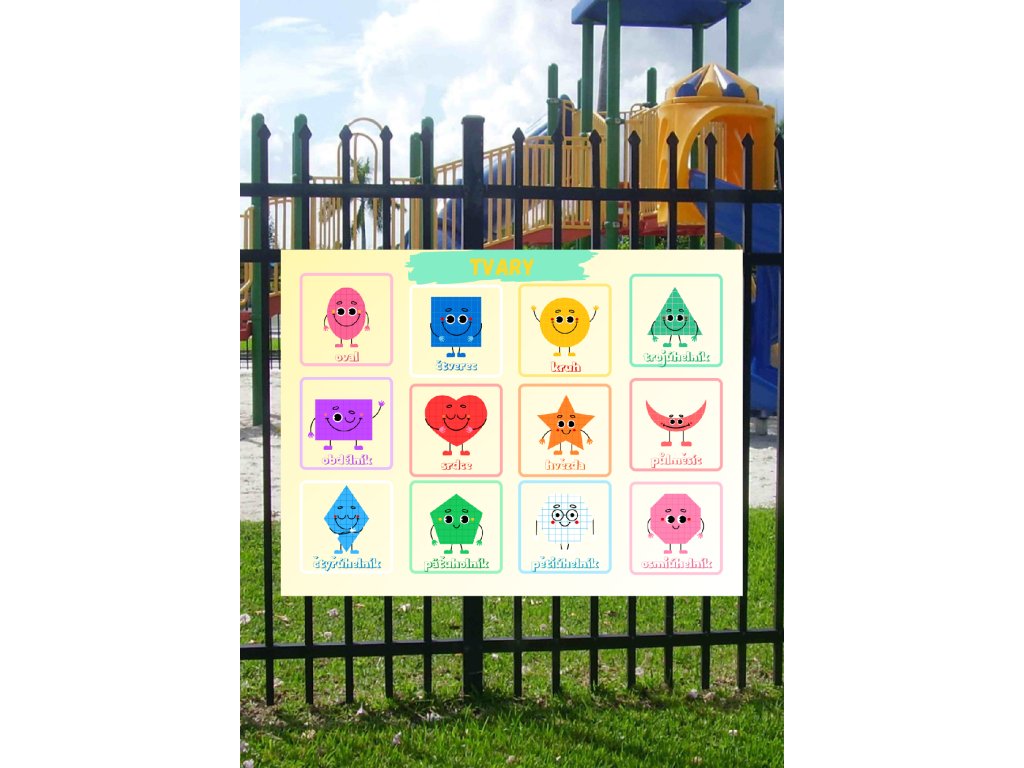 aby se hodila k jakémukoli exteriérovému prostředí. Montáž: Tabule má na každém kraji otvor, vhodný k přišroubování tabule nebo jejímu přivázání o plot.