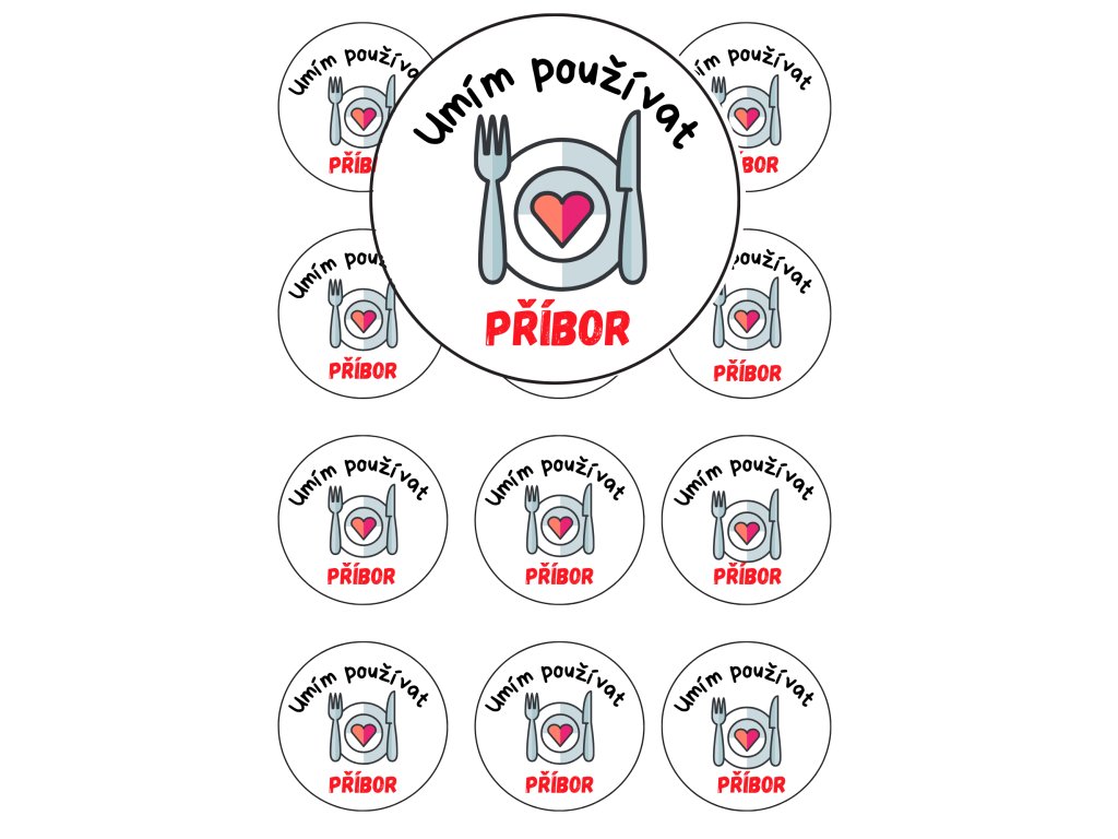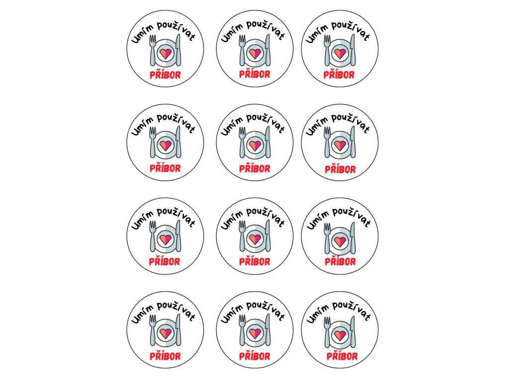 Motivační samolepky ,,Umím používat příbor" Formát: A4 - obsahuje 12 kusů předřezaných samolepek o průměru 6 cm. Praktické využití: - pro děti do MŠ ale i na doma - vhodné jako hodnocení nebo odměna