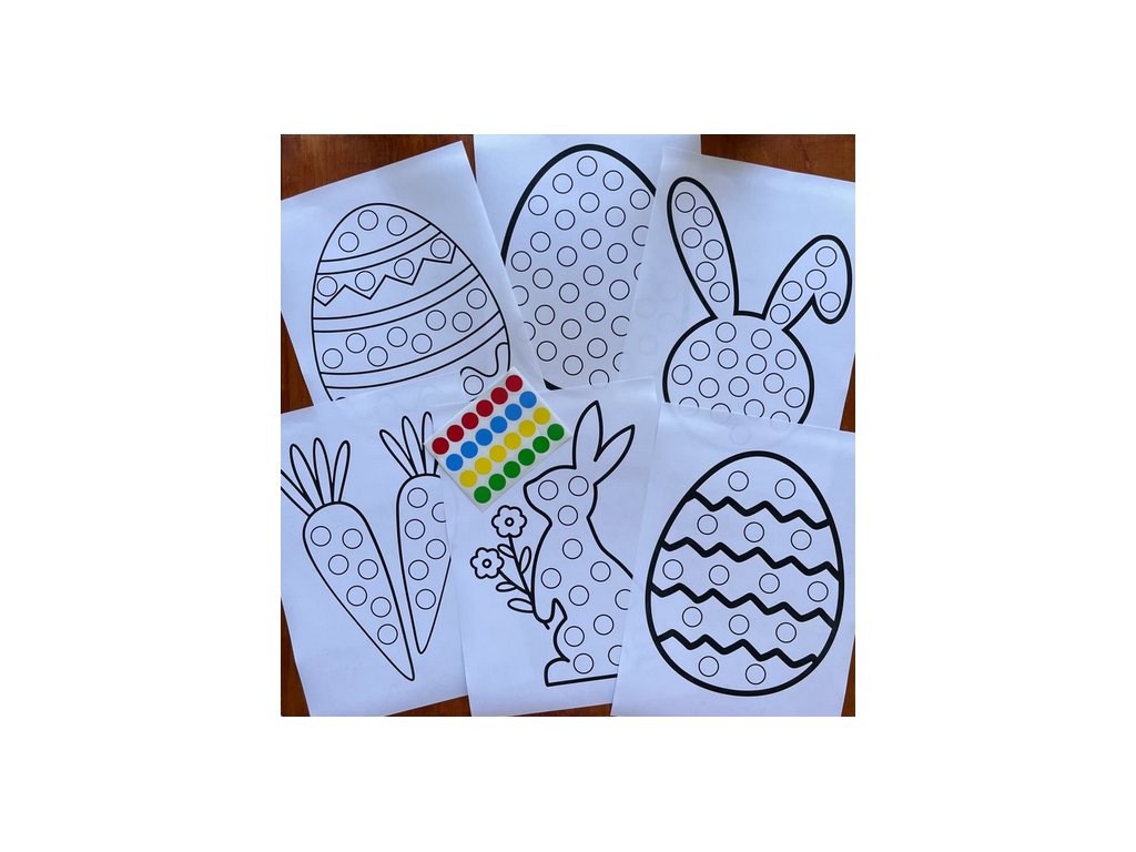 Sada obsahuje 24 ks omalovánek formátu A4, na kterých je vytištěno šest druhů obrázků s tématem Velikonoce. K sadě obdržíte 700 ks pestrobarevných nálepek, kterými barevně děti dotváří obrázky.