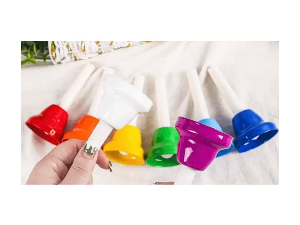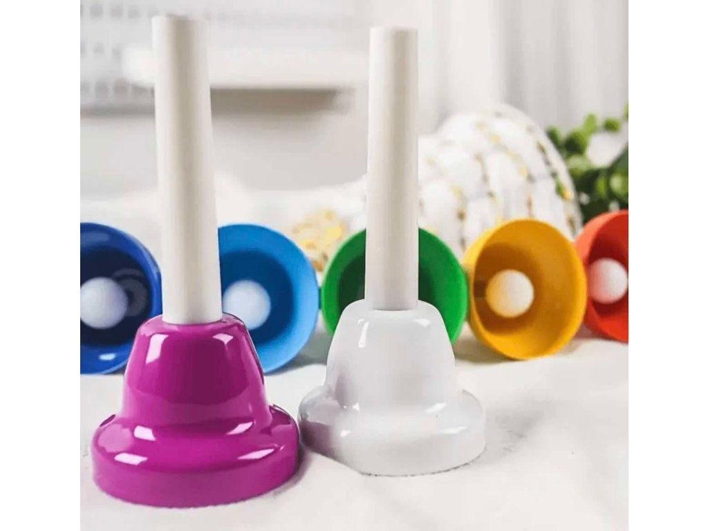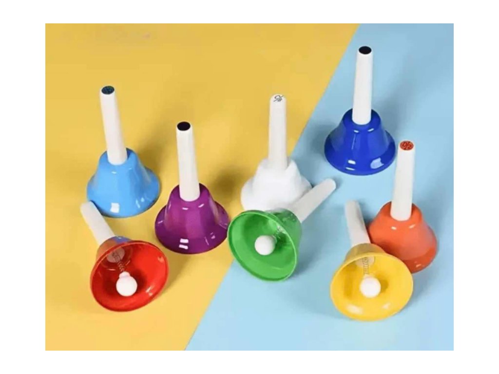 Osmidílná sada ručních zvonků v náhodném barevném provedení + notové zápisy 15ti dětských písní s barevnými značkami, které umožní dětem hrát melodii podle barev.