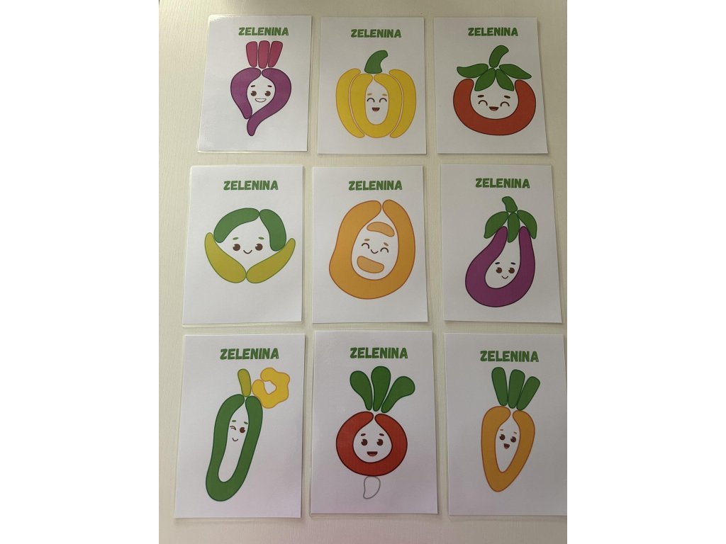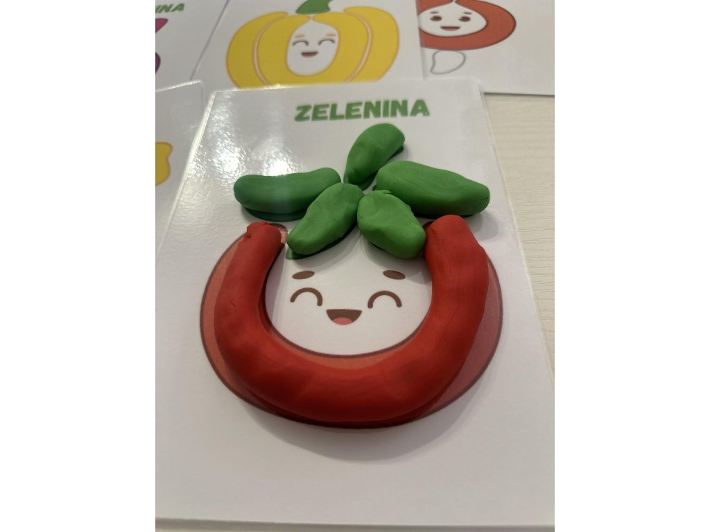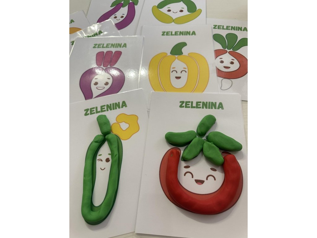Sada podložek pro modelování z plastelíny s tématikou ZELENINA. Celá sada obsahuje 11 kartiček formátu A5, které jsou potaženy transparentní fólií, umožňující jejich opakované použití. Kartičky podporují rozvoj vizuálního vnímání dětí, lze je použít pro práci s plastelínou, čímž rozvíjejí jemnou motorku dětí.