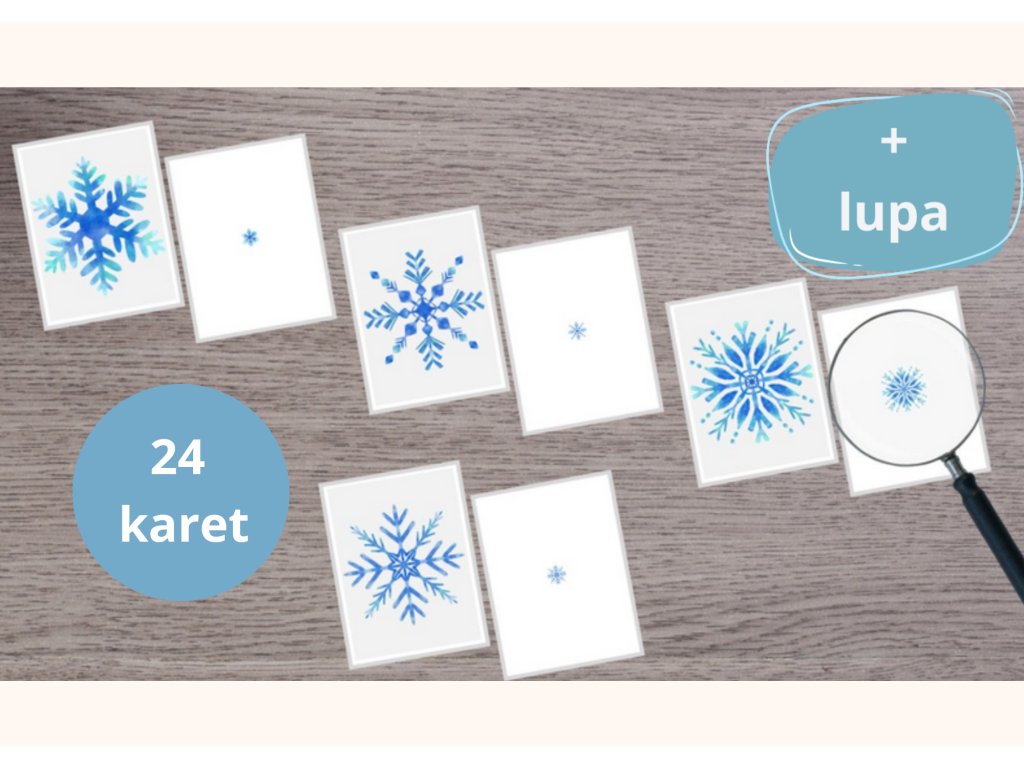 12 kusů karet představuje zvětšenou verzi sněhových vloček, zbývajících 12 kusů karet jejich zmenšenou verzi.